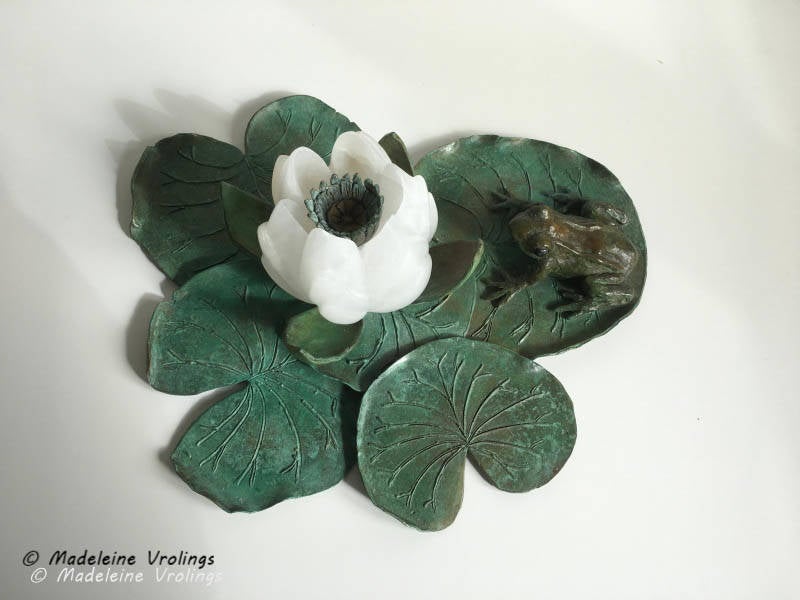 De bladeren en kikker zijn van brons en de waterlelie is gemaakt van albast
