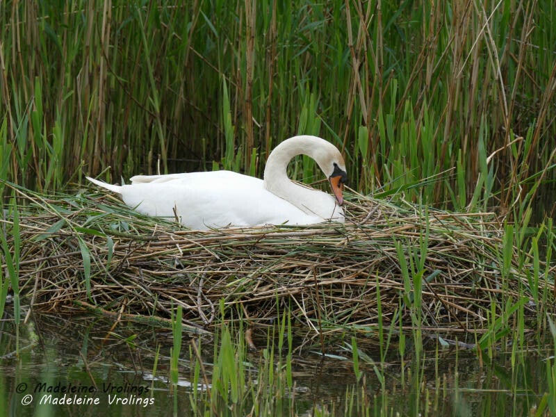 zwaan op nest en jonge meerkoetjes in Zevenbergen